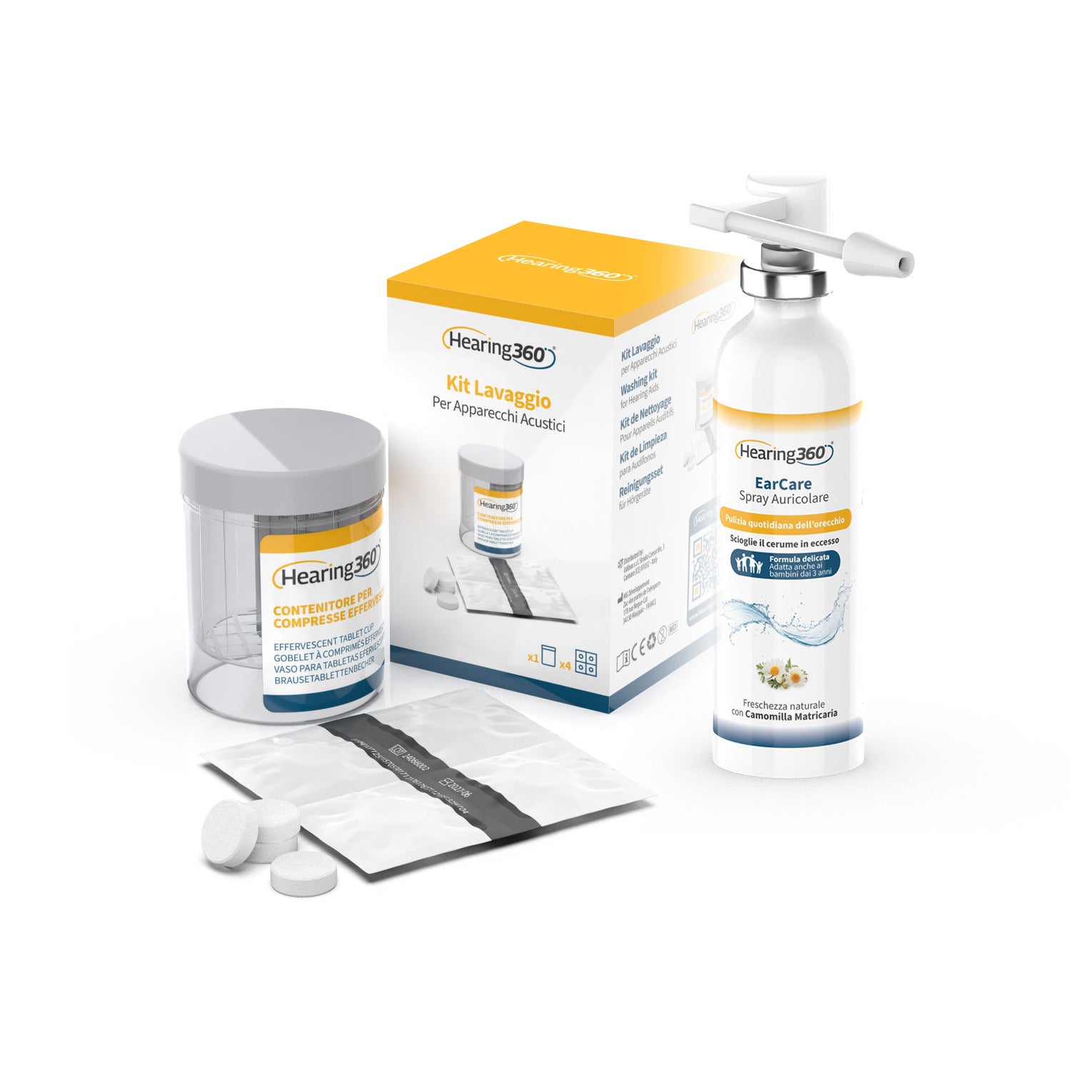 Il Washing Kit, grazie alle sue compresse effervescenti, permette di lavare le parti degli apparecchi acustici compatibili, rimuovendo sporco, cerume e residui con un’azione profonda e sicura.