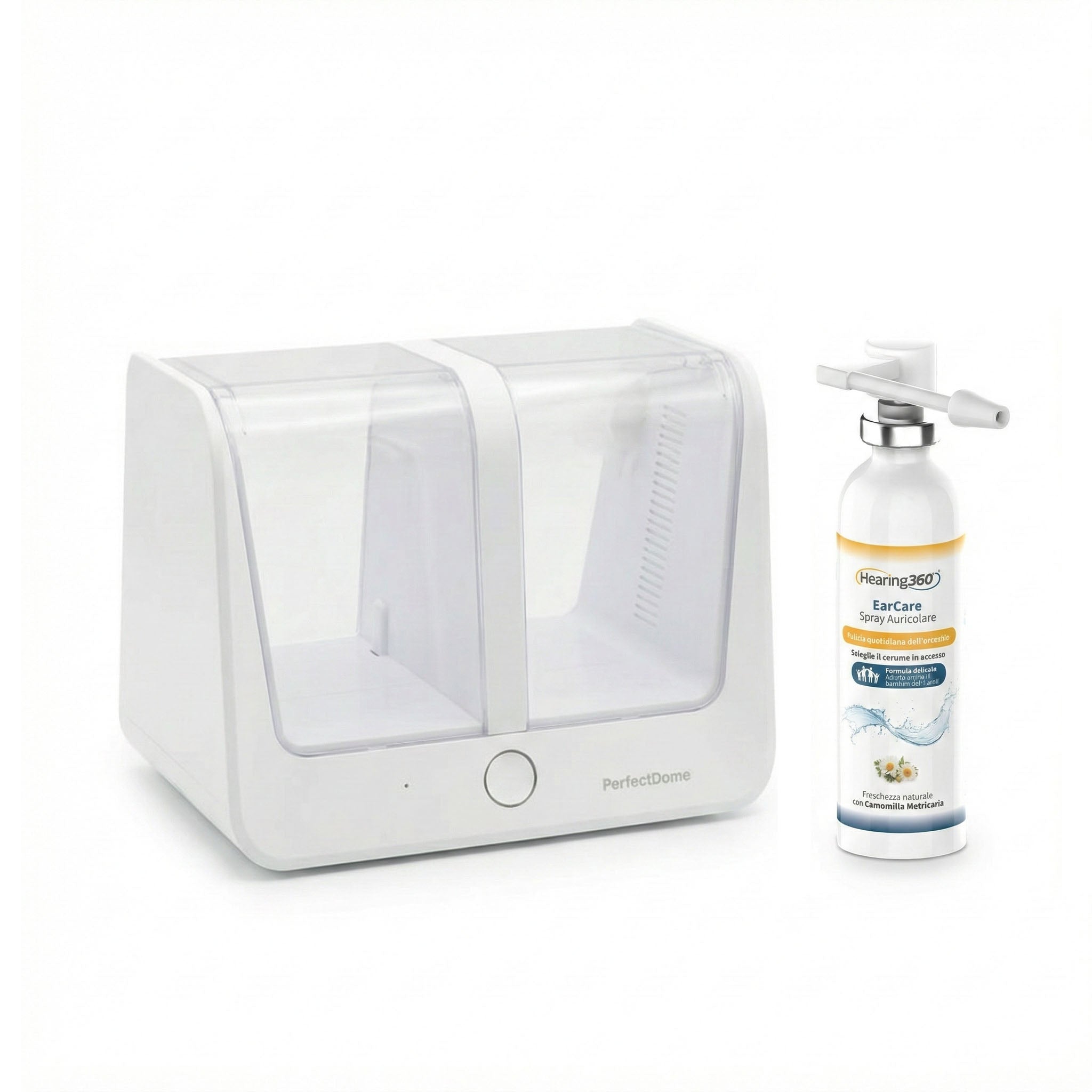 Questo kit offre una soluzione semplice per la pulizia dell’orecchio e la cura quotidiana degli apparecchi acustici. Lo spray aiuta a sciogliere il cerume in modo delicato, mentre il PerfectDome protegge i dispositivi riducendo umidità e batteri grazie alla luce UV-C. Insieme favoriscono un ascolto più confortevole e mantengono gli apparecchi più igienici e affidabili.